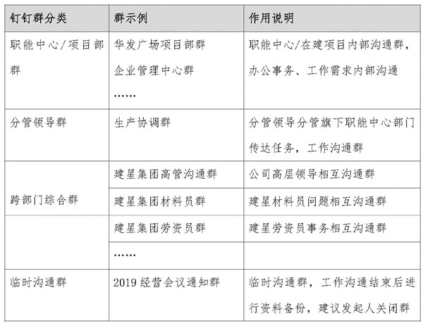 請公司各位負責(zé)人及同事于 2019 年 2 月 28 日前,關(guān)閉相關(guān)的 QQ 和微信工作群,在釘釘建立工作溝通群,逾期未進行該項工作的人員將予以警告。原則上只允許存在一個中心職能部門群或項目部管理群;建立跨部門臨時群時,需按照誰主導(dǎo)誰發(fā)起的原則進行建立臨時溝通群,事務(wù)溝通結(jié)束后,建議將相關(guān)文件資料進行備份后解散關(guān)閉釘釘群;若是建立跨部門永久綜合溝通群,則以主管領(lǐng)導(dǎo)的身份進行建立釘釘群,并制定好群規(guī),保證工作的有效溝通和效率。