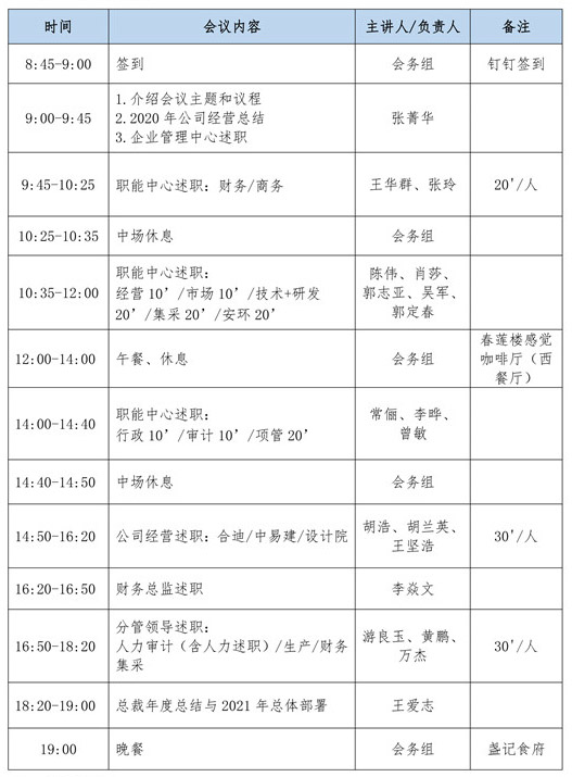(3) 各分管領導、子公司負責人、業(yè)務與職能中心負責人和項目經(jīng)理需按公司統(tǒng)一要求編寫年終工作總結(jié) PPT(模板見附件),并按時提交給企業(yè)管理中心李凡匯總,其中:職能中心和項目經(jīng)理請于 2021 年 1 月 4 日下班前提交,項目經(jīng)理統(tǒng)一由項管中心歸集后提交,集團分管領導及子公司負責人請于 1 月 9 日下班前提交;