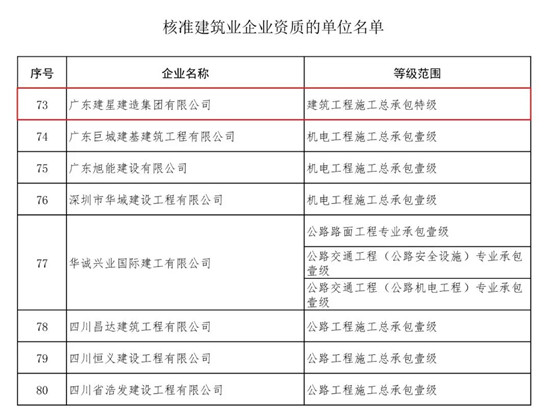 2020年12月31日,住房和城鄉建設部公布2020年第十批建設工程企業資質名單,建星集團順利通過審核,晉升建筑工程施工總承包特級資質,成為我省近三年唯一一家獲得建筑工程總承包特級資質的企業。目前,廣東省建筑業特級資質數量增至31家。